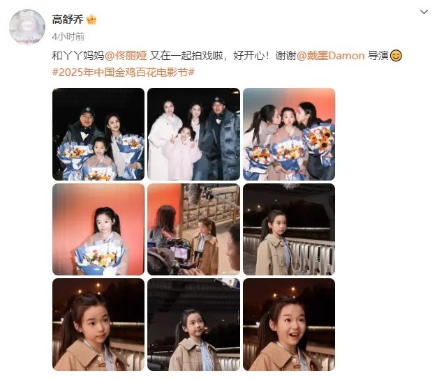 12日,董璇女儿小酒窝(高舒乔)在社交平台上发文回应与佟丽娅一起出演金鸡奖开幕式短片,她表示:“和丫丫妈妈(佟丽娅)又在一起拍戏啦,好开心!谢谢戴墨导演。”
